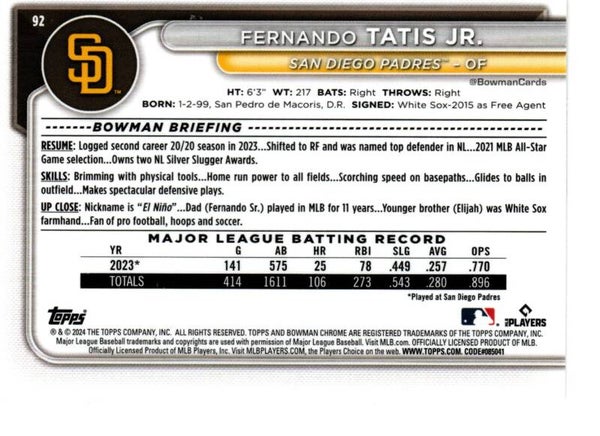 Bowman Chrome 2024 Mega Box Mojo Blue 101/150 #92 Fernando Tatis Jr., San Diego Padres