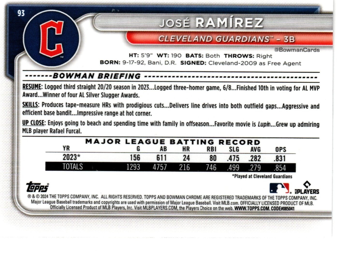 Bowman Chrome 2024 #93 José Ramírez, Cleveland Guardians