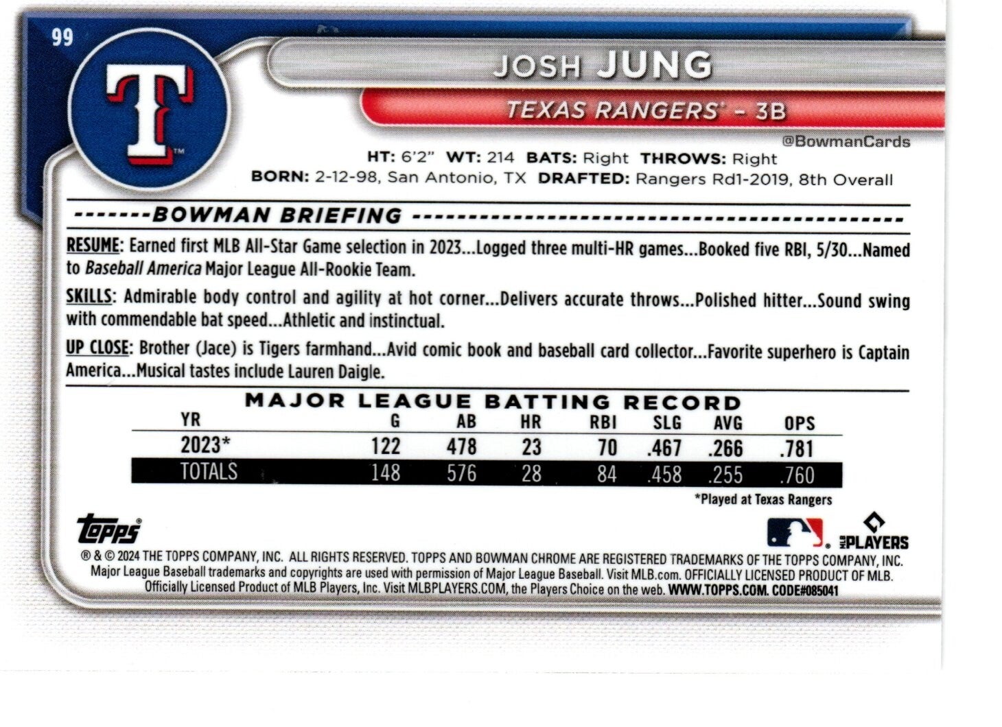Bowman Chrome 2024 #99 Josh Jung, Texas Rangers