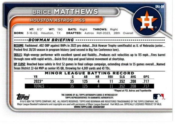 Bowman Chrome 2024 Mega Box Auto Mojo #BMA-BM Brice Matthews, Houston Astros