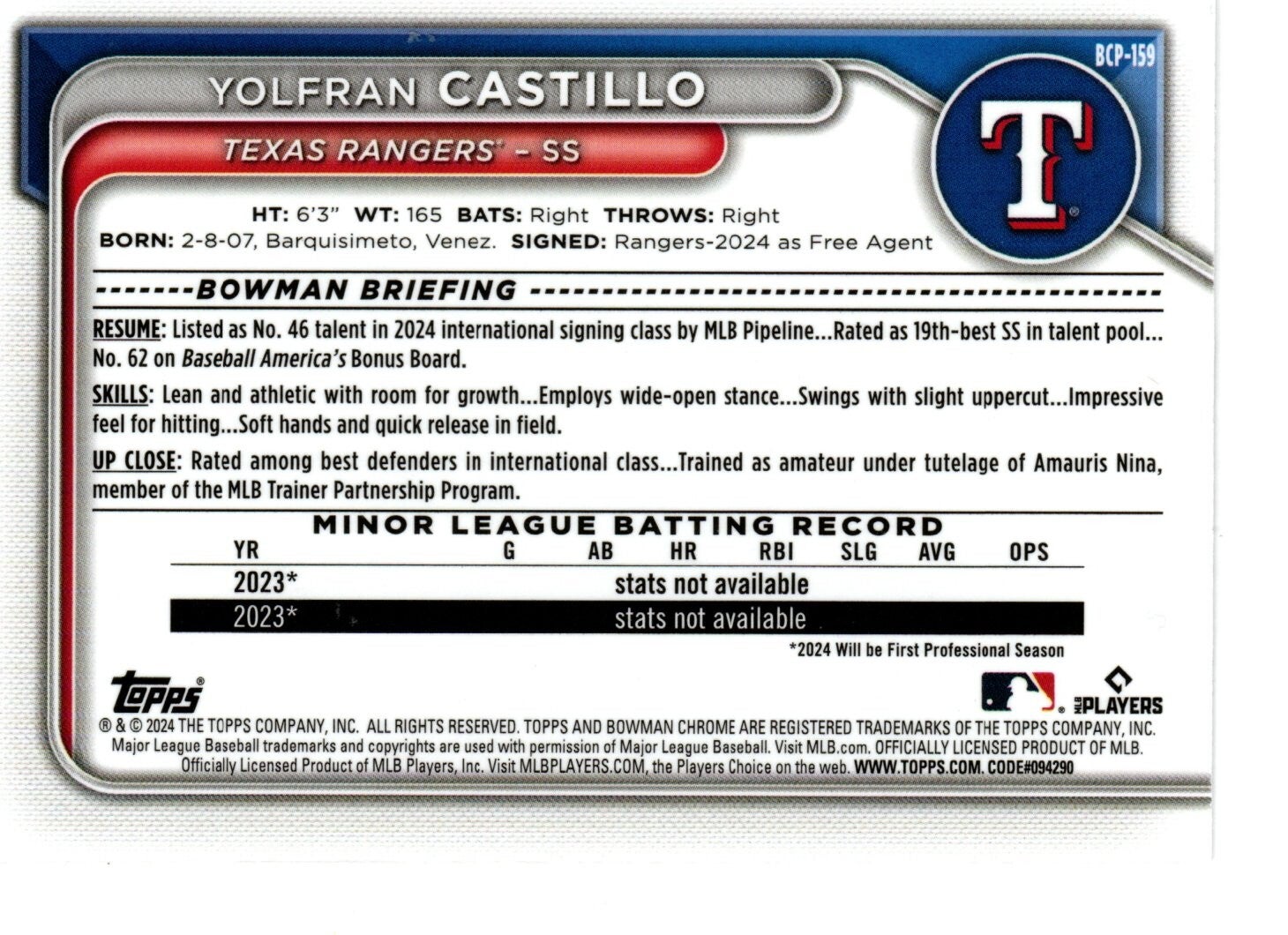 Bowman Chrome 2024 Mega Box Prospects Mojo #BCP-159 Yolfran Castillo, Texas Rangers
