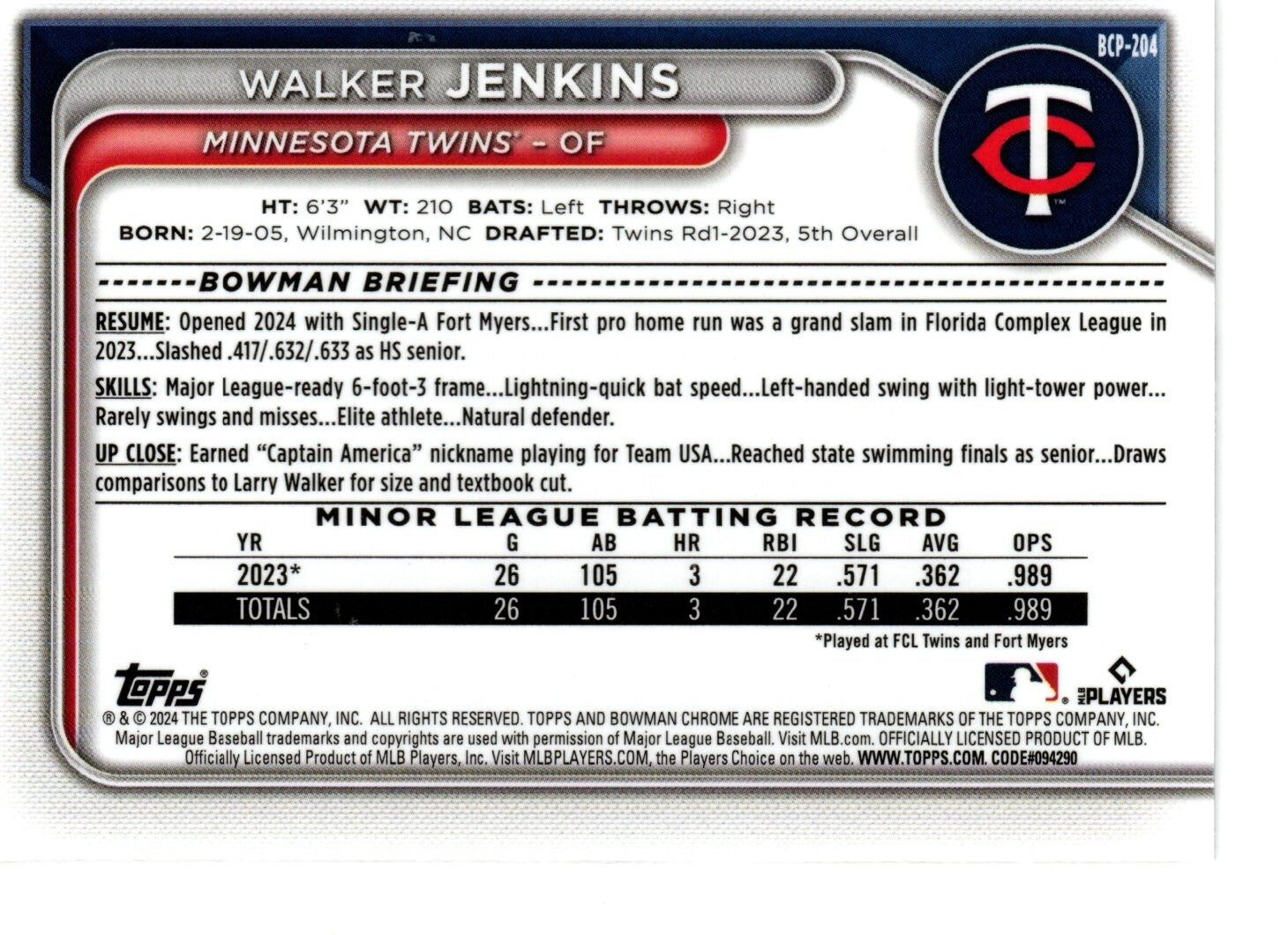 Bowman Chrome 2024 Mega Box Prospects Mojo #BCP-204 Walker Jenkins, Minnesota Twins