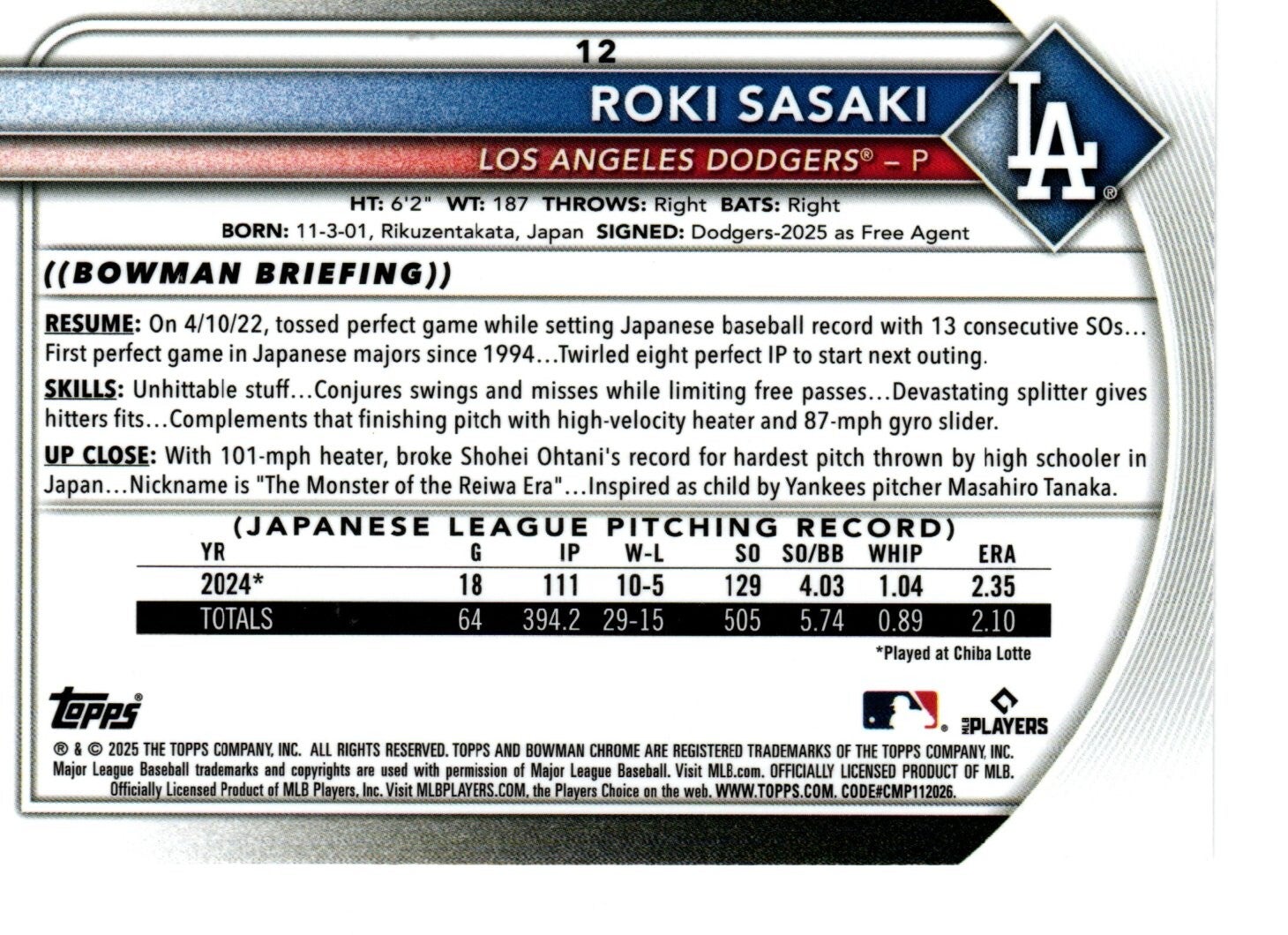 12 Roki Sasaki, Los Angeles Dodgers RC