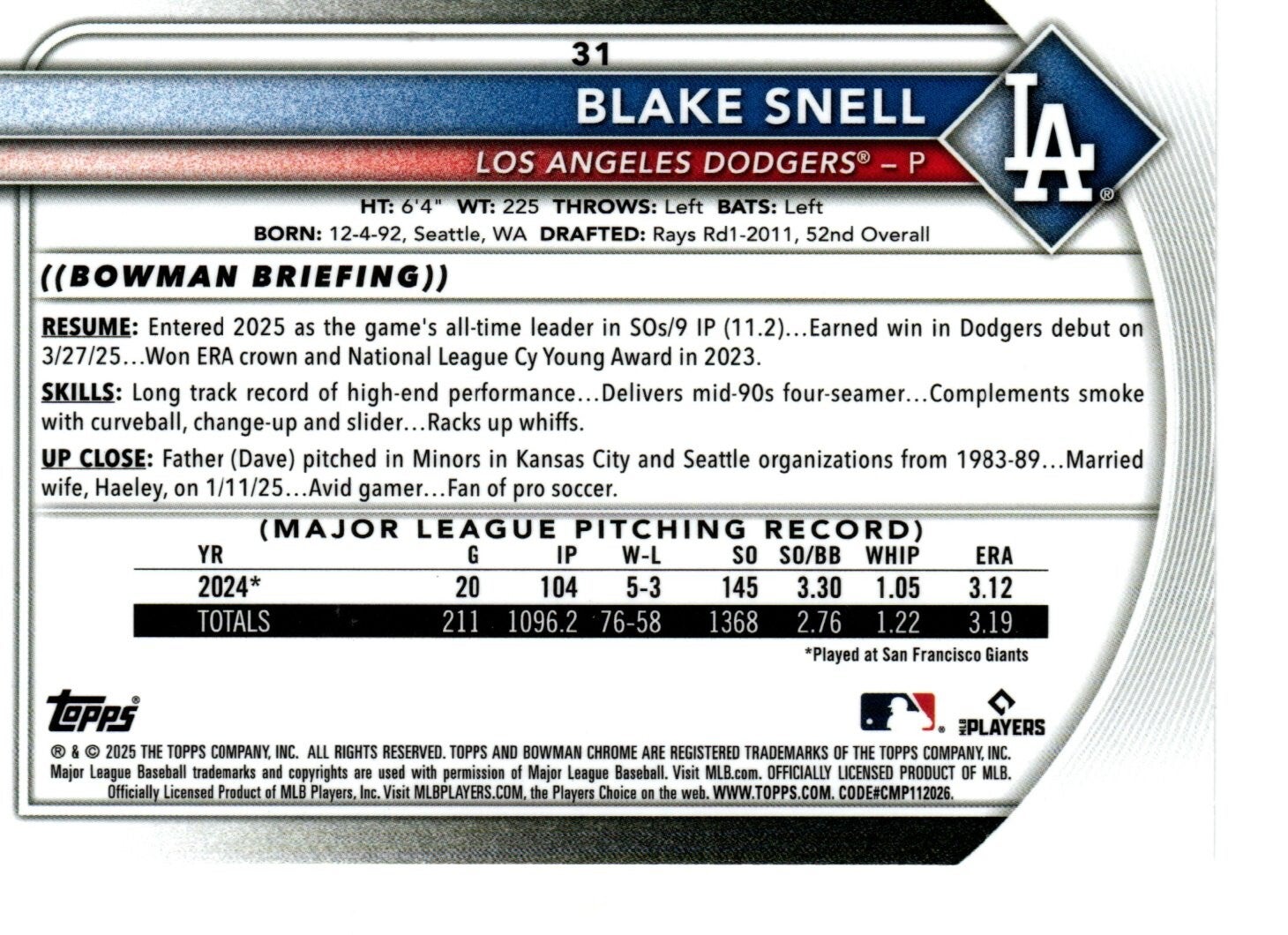 Bowman Chrome 2025 #31 Blake Snell, Los Angeles Dodgers