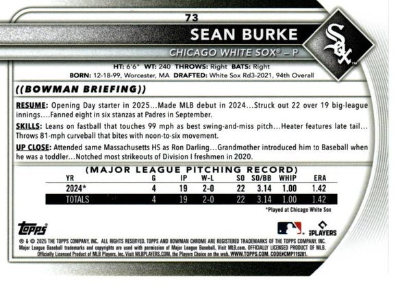 Bowman Chrome 2025 #73 Sean Burke, Chicago White Sox RC