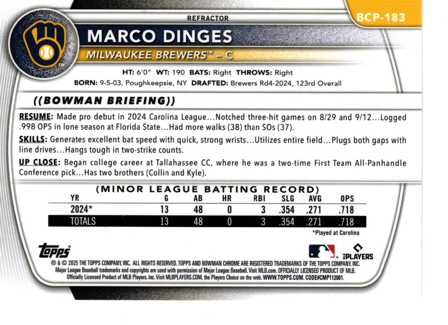 Bowman Chrome 2025 Prospects Refractor 429/499 #BCP-183 Marco Dinges, Milwaukee Brewers