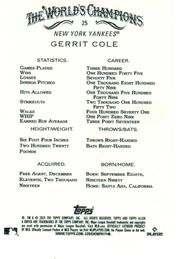 Allen & Ginter 2024 #25 Gerrit Cole, New York Yankees