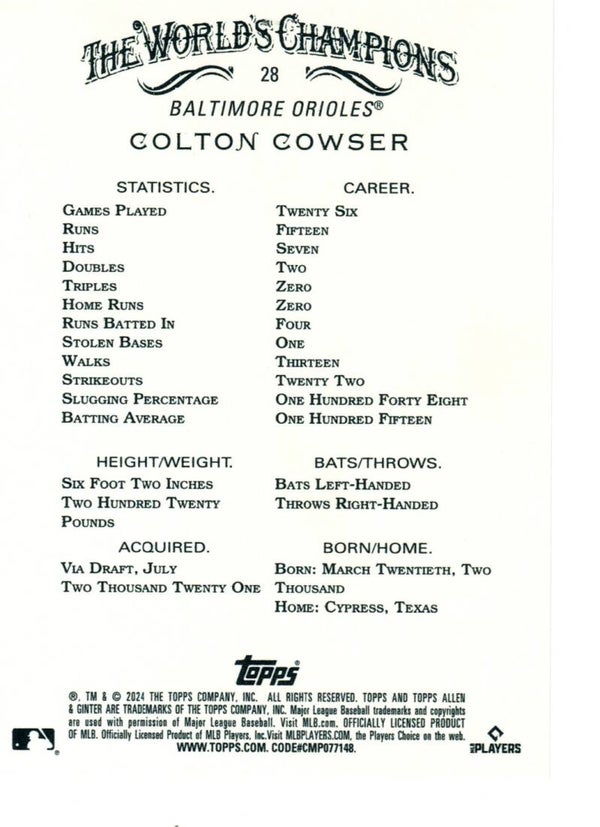 Allen & Ginter 2024 #28 Colton Cowser, Baltimore Orioles (RC)