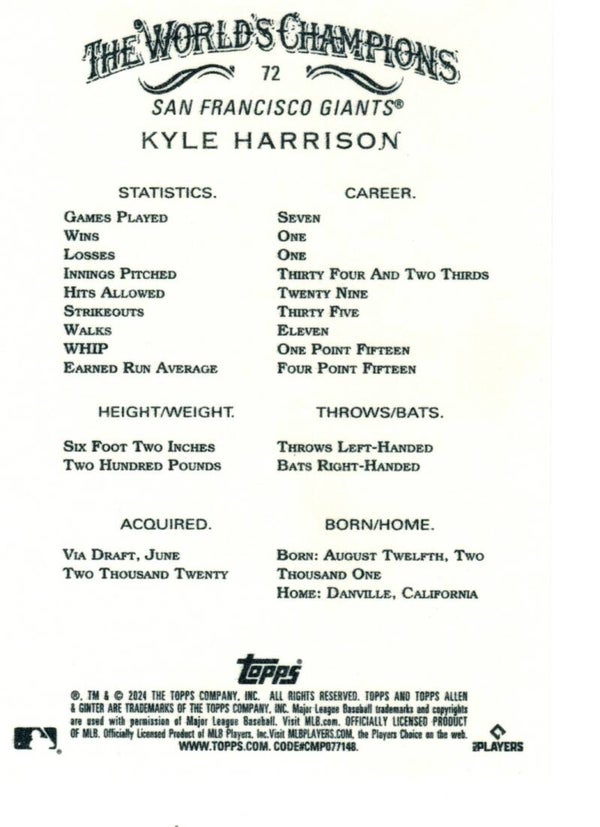 Allen & Ginter 2024 #72 Kyle Harrison, San Francisco Giants RC