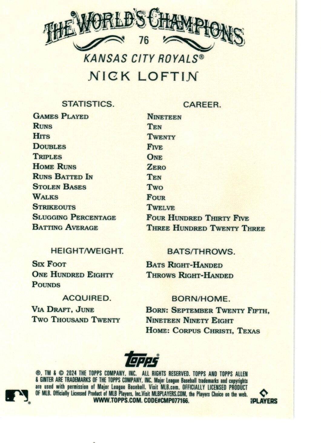 Allen & Ginter 2024 #76 Nick Loftin, Kansas City Royals RC