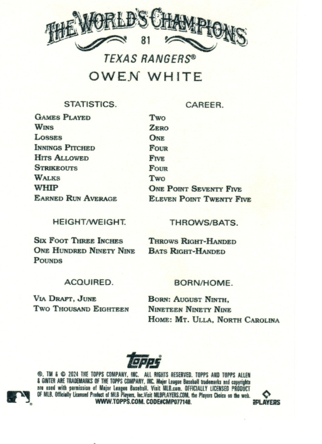 Allen & Ginter 2024 #81 Owen White, Texas Rangers RC