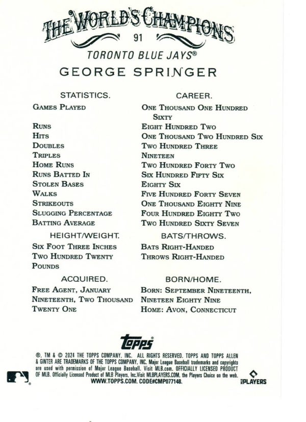 Allen & Ginter 2024 #91 George Springer, Toronto Blue Jays
