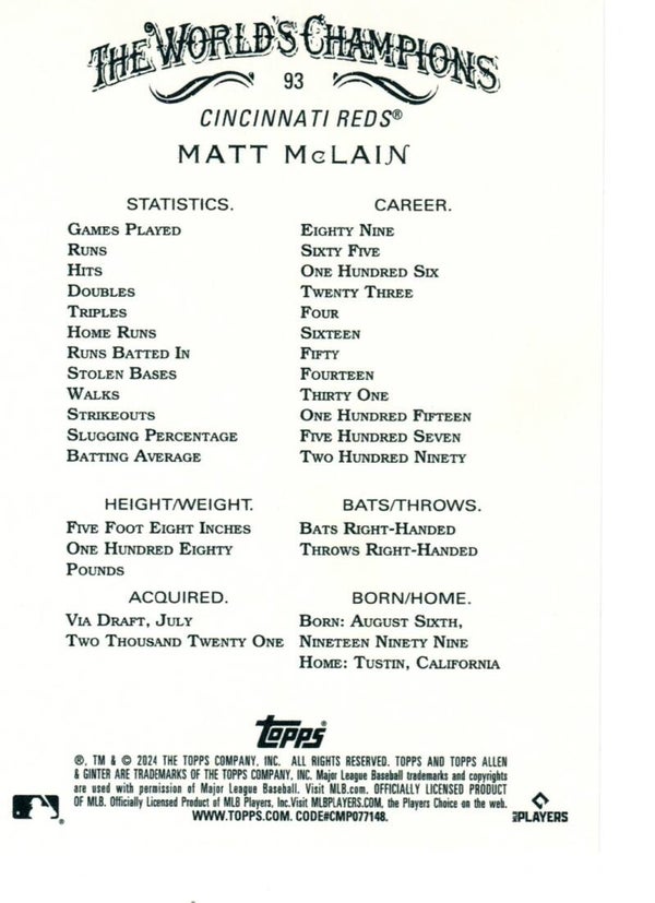 Allen & Ginter 2024 Silver Portrait #93 Matt McLain, Cincinnati Reds