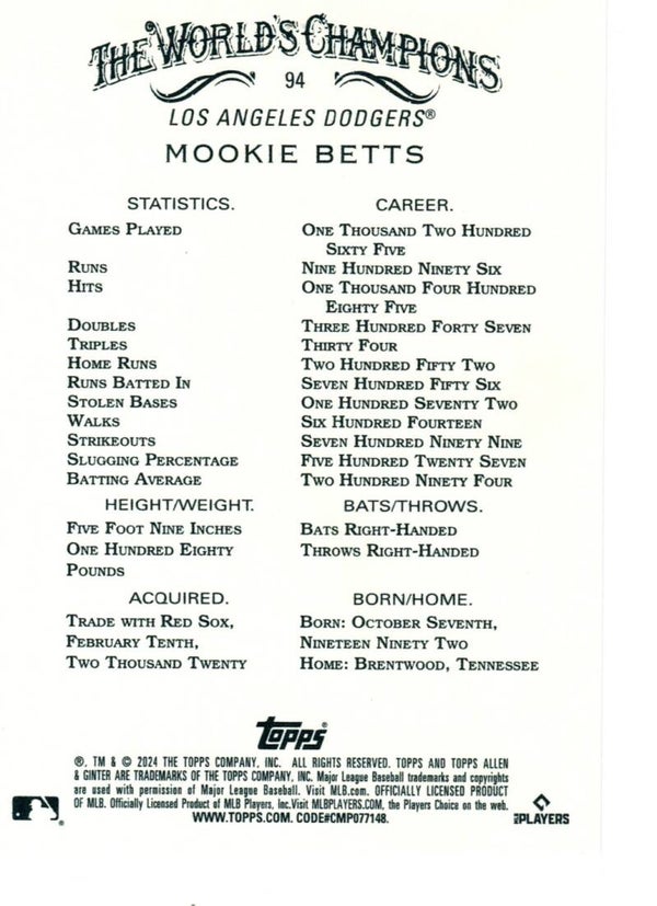 Allen & Ginter 2024 Silver Portrait #94 Mookie Betts, Los Angeles Dodgers